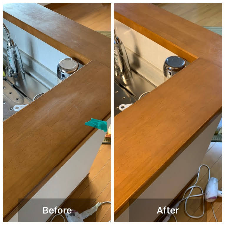 さらに色味だけでなく、キッチンカウンターを擦ったことによる艶感のずれも元に戻し再現することで、違和感のないように仕上げています。