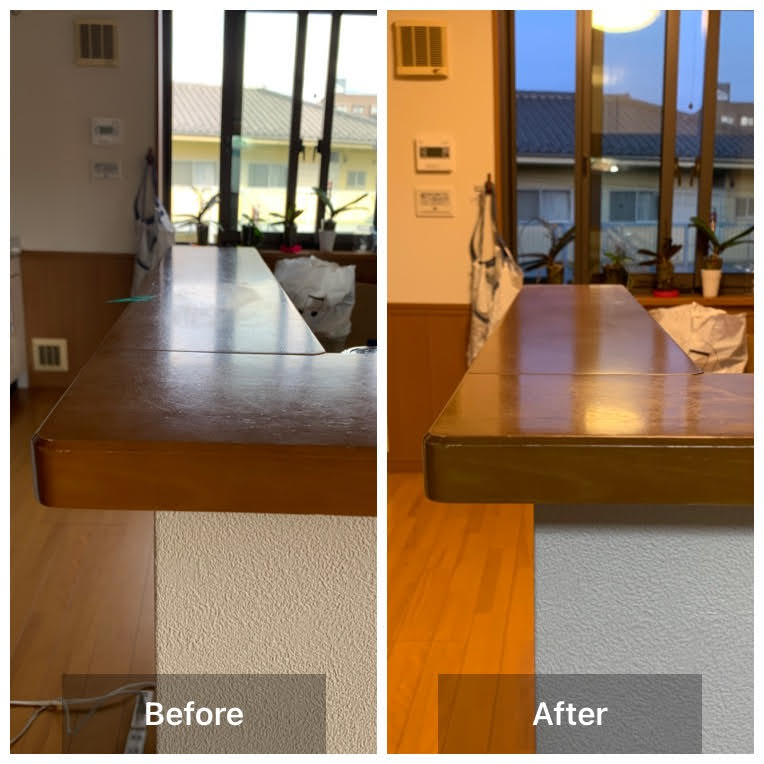 ※施工前はキッチンカウンター上に映り込んでいる窓枠が途中で切れてしまっていますが、施工後はしっかりと全て映り込んでいます。