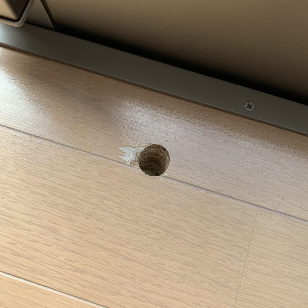 フローリングの掃き出し窓付近にエアコン用のダクト穴を開けたそうですが、誤った位置に開けてしまったようで、思い切り目立った場所でした。