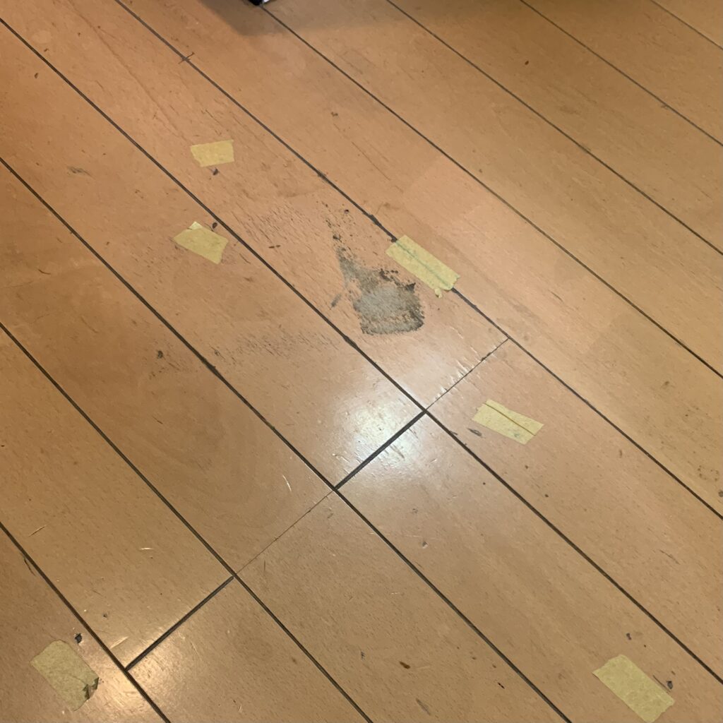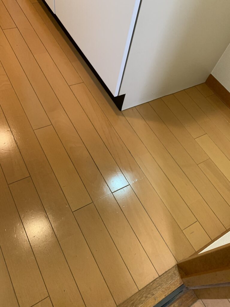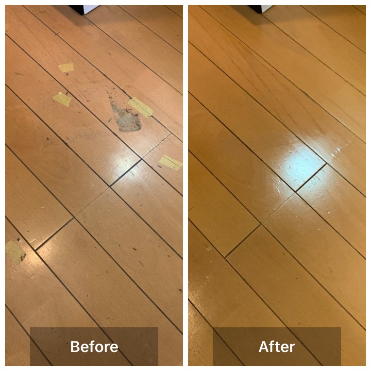 原状回復の場合、ワックスをクリーニング業者さんがかけるケースが多いですが、補修した箇所はどうしても艶感が落ちてしまいがちなのため、板一枚分のピースに区切って別でワックスをかけておくと艶感が整いやすくなります。