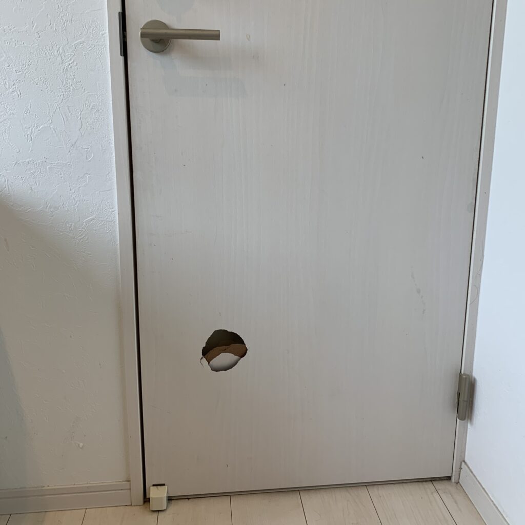 思いっきりキックをしてしまったのか、完全に陥没していましたね。今回賃貸物件のご退去前でのご依頼をいただきました。