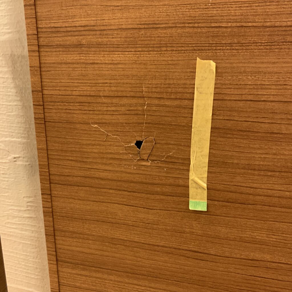 何かをぶつけてしまったのか、貫通まではしていませんでしたが、広範囲にわたりひび割れと陥没穴になっていました。