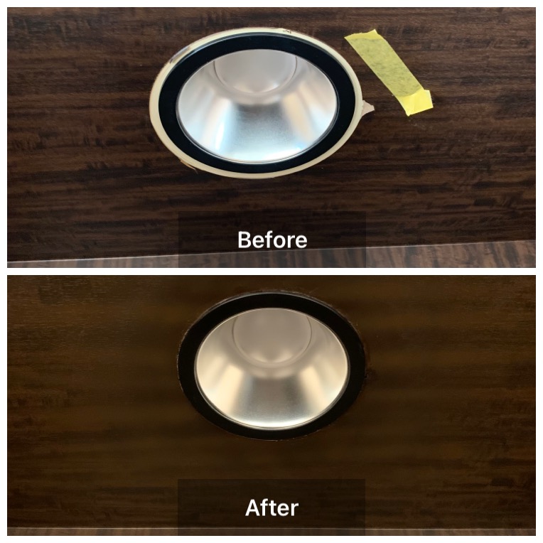 ダウンライトを交換したところ、元々のシートの寸法に合っておらず、周りがくり抜かれたようになってしまっておりました。