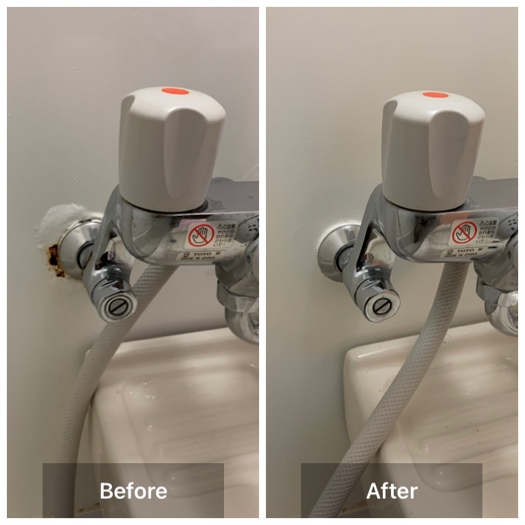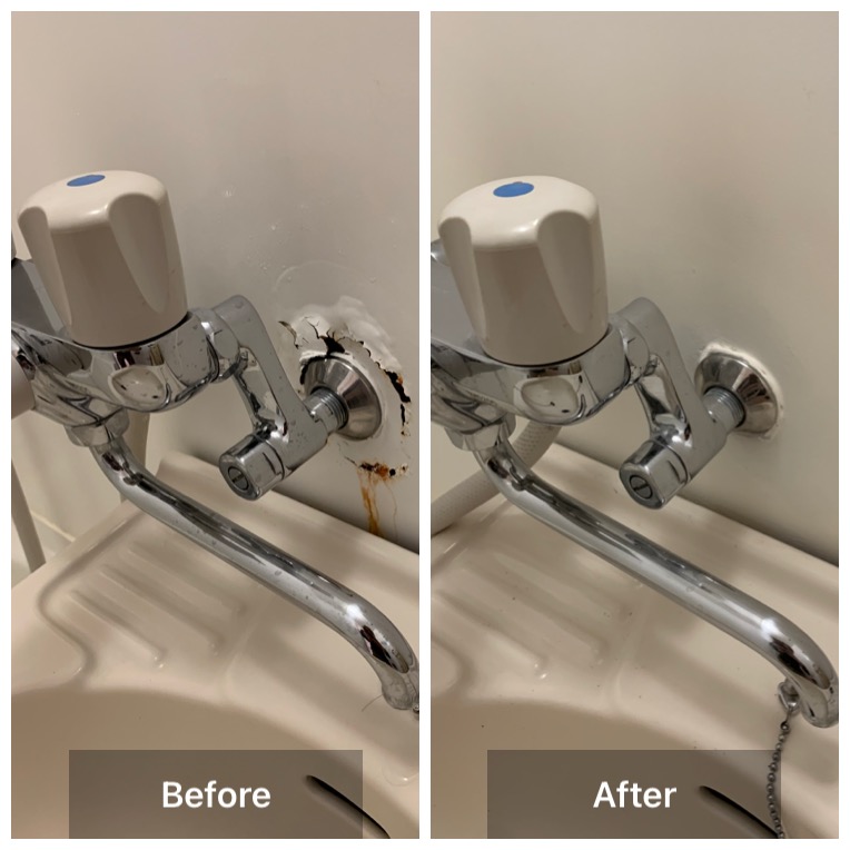 他にも浴槽や洗面台蛇口付近は、水分を大量に含んだことによる水膨れが広範囲で広がっており、こちらは中が全て錆びたり空洞になってしまったりしておりました。