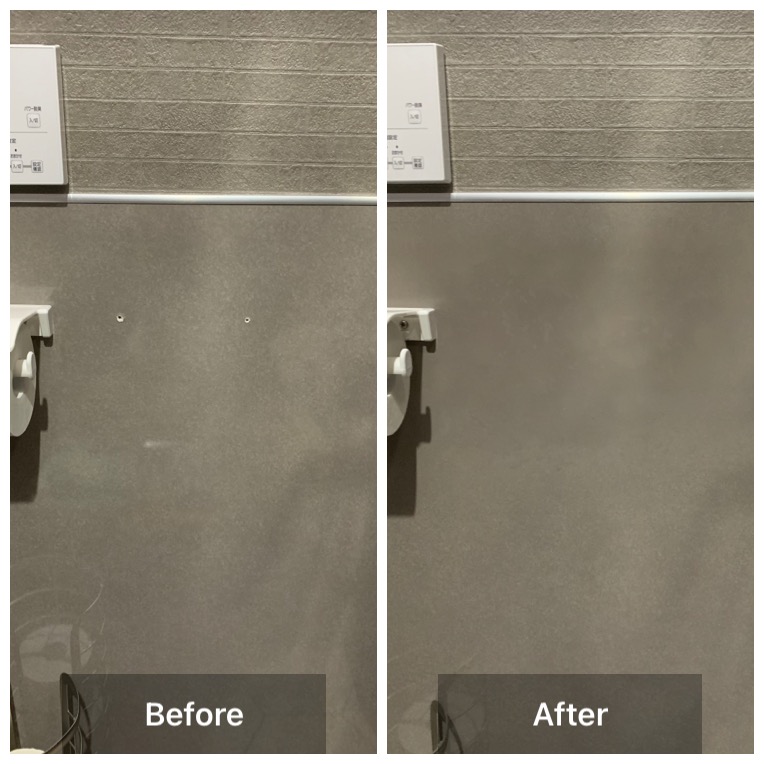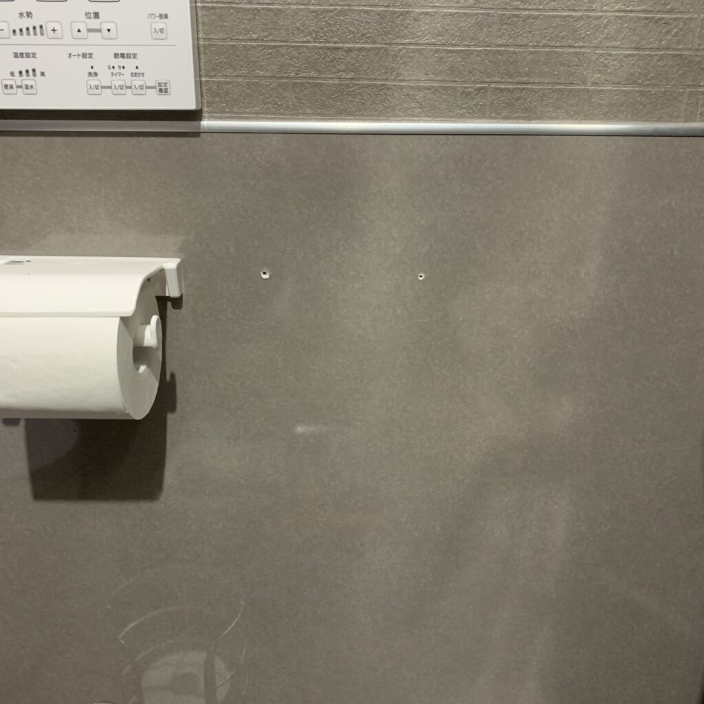 トイレットペーパーホルダーの位置を変更した際に元々空いていたビス穴が見えてしまうため、リペアで目立たなくして欲しいとのことでした。